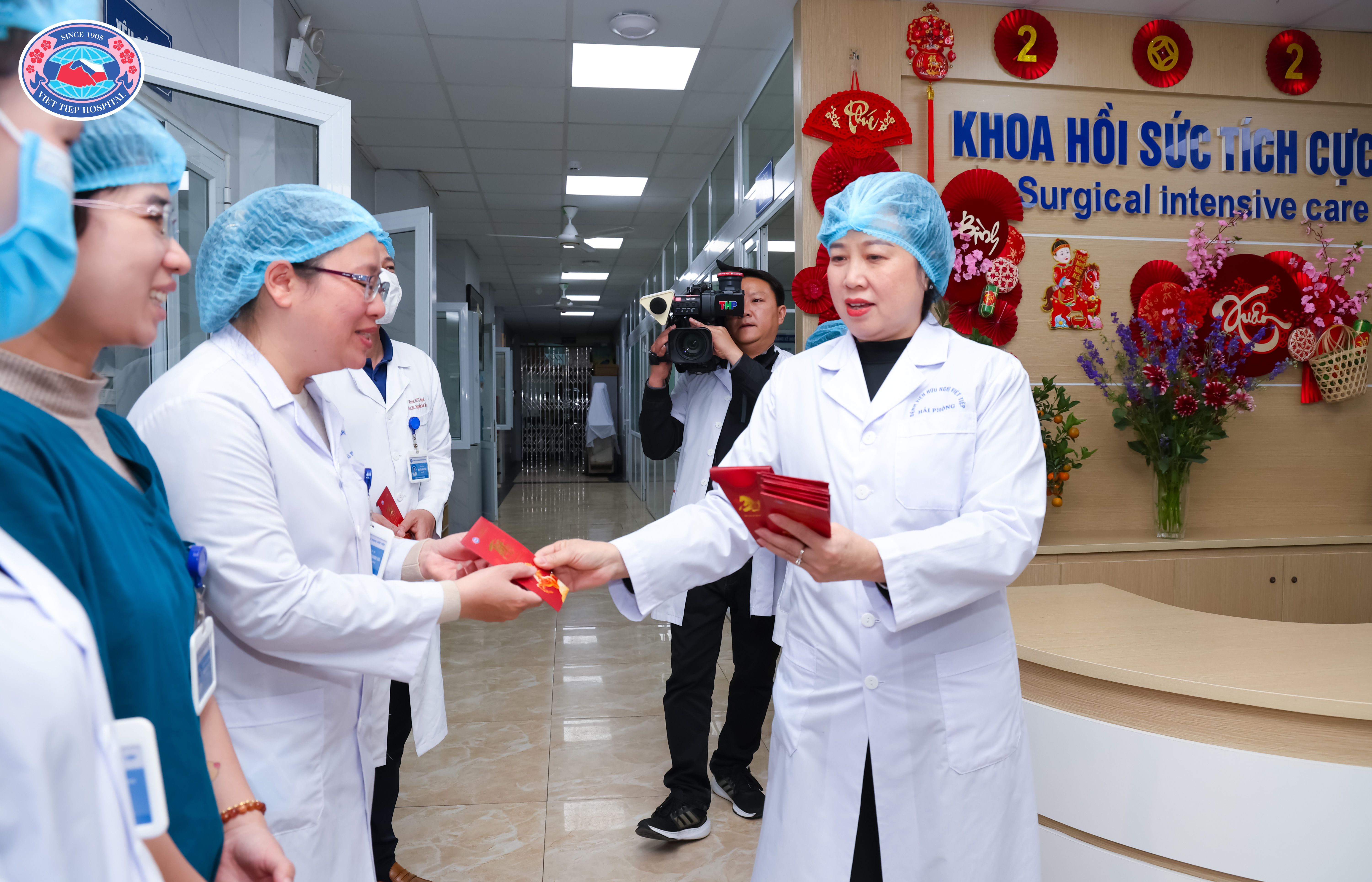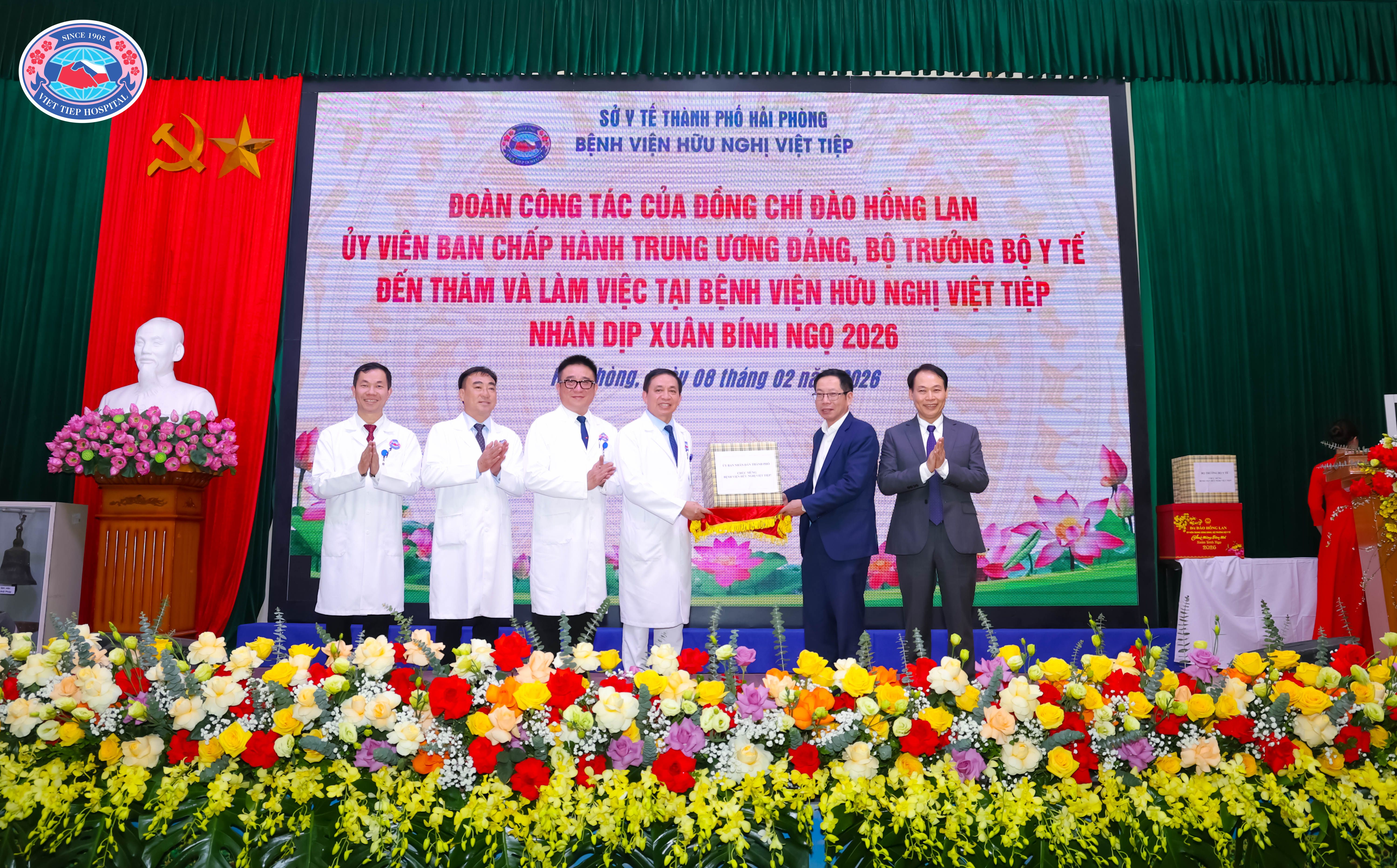 (Thay mặt Ủy ban nhân dân thành phố Hải Phòng, đồng chí Vũ Tiến Phụng – Uỷ viên Ban thường vụ Thành uỷ, Phó Chủ tịch UBND thành phố Hải Phòng cùng đồng chí Lê Minh Quang – Giám đốc Sở Y tế trao quà, chúc Tết tập thể cán bộ, y bác sĩ, nhân viên y tế Bệnh viện Hữu Nghị Việt Tiệp)