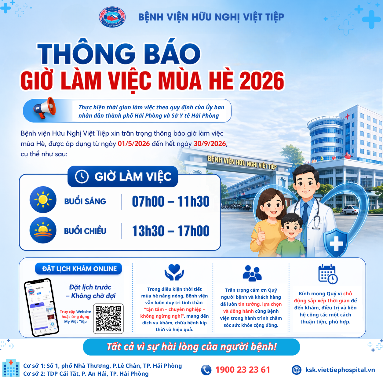 📍 Thực hiện thời gian làm việc theo quy định của Ủy ban nhân dân thành phố Hải Phòng và Sở Y tế Hải Phòng, Bệnh viện Hữu Nghị Việt Tiệp trân trọng thông báo điều chỉnh giờ làm việc mùa hè, áp dụng từ 01/5/2026 đến hết 30/9/2026 như sau:
