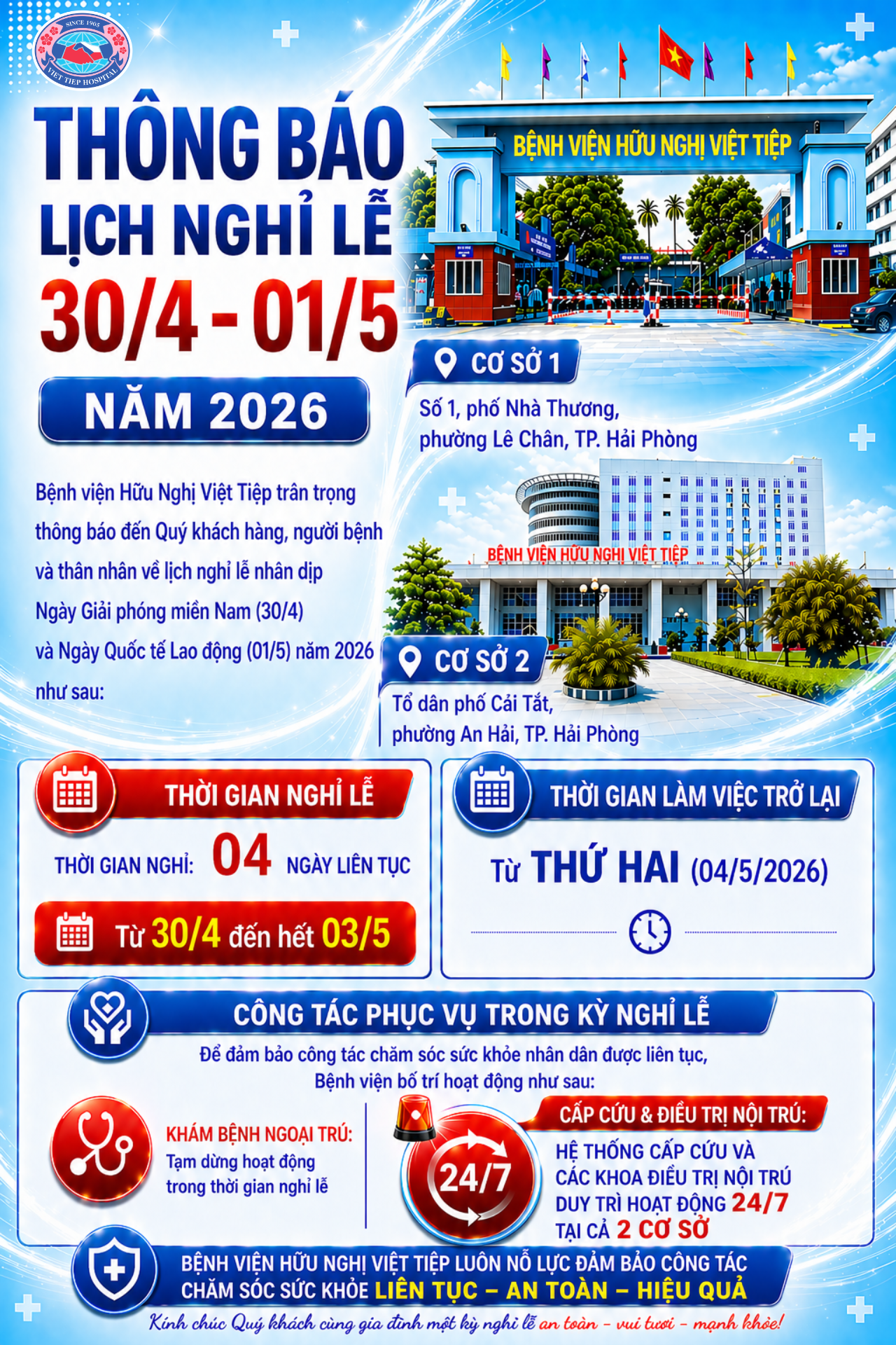 🏥 Bệnh viện Hữu Nghị Việt Tiệp trân trọng thông báo đến Quý khách hàng, người bệnh và thân nhân về lịch nghỉ lễ nhân dịp Ngày Giải phóng miền Nam, thống nhất đất nước (30/4) và Ngày Quốc tế Lao động (01/5) năm 2026 như sau: